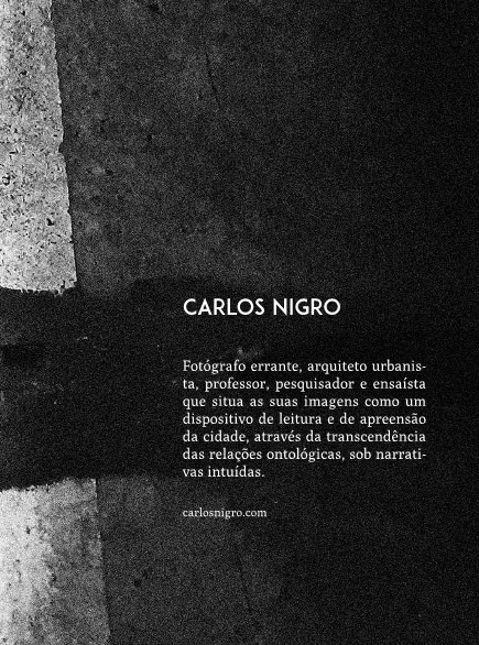 O legado do Atlas Mnemosyne para as artes visuais, de Aby Warburg, tal como um arranjo-constelação de imagens e pensamentos, perpetua uma cartografia de afetos e de desejos, referências adotadas num painel semântico mental pelo arquiteto e urbanista Carlos Nigro, um fotógrafo errante que lança o seu mais novo ensaio literário-visual e, assim, provoca a percepção e a leitura do oculto e da complexidade da cidade, bem como convida a participação de uma vida de modo mais criativo e libertário, nômade, sob uma narrativa surreal-esquizoanalista: devir.